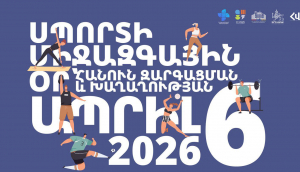 ՄԱԿ Գլխավոր ասամբլեայի որոշմամբ ապրիլի 6-ը հռչակվել է Սպորտի միջազգային օր։ 2013 թվականից տարբեր երկրներում նշվում է այդ օրը՝ հանուն զարգացման և խաղաղության։ Օրվա շրջանակում ԿԳՄՍ, Առողջապահության, Ներքին գործերի նախարարությունների և Երևանի քաղաքապետարանի համագործակցությամբ կանցկացվեն մի շարք միջոցառումներ՝ բացօթյա