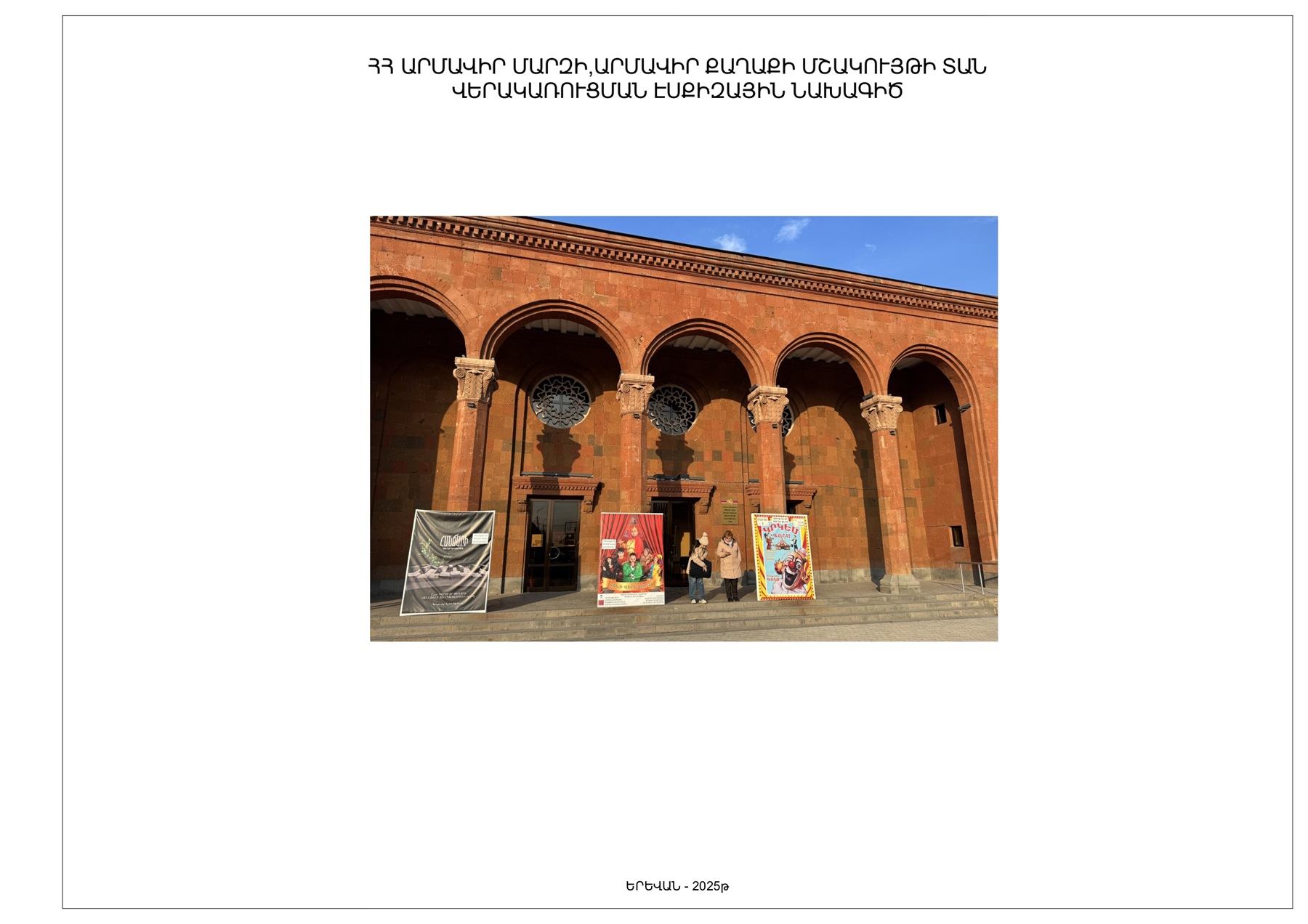 - Արմավիրի մարզի Արմավիր քաղաքի մշակույթի տան լրամշակված էսքիզային նախագիծը համարվել է ընդունելի պայմանով, որ նախագծում կպահպանվեն բոլոր նորմատիվները: