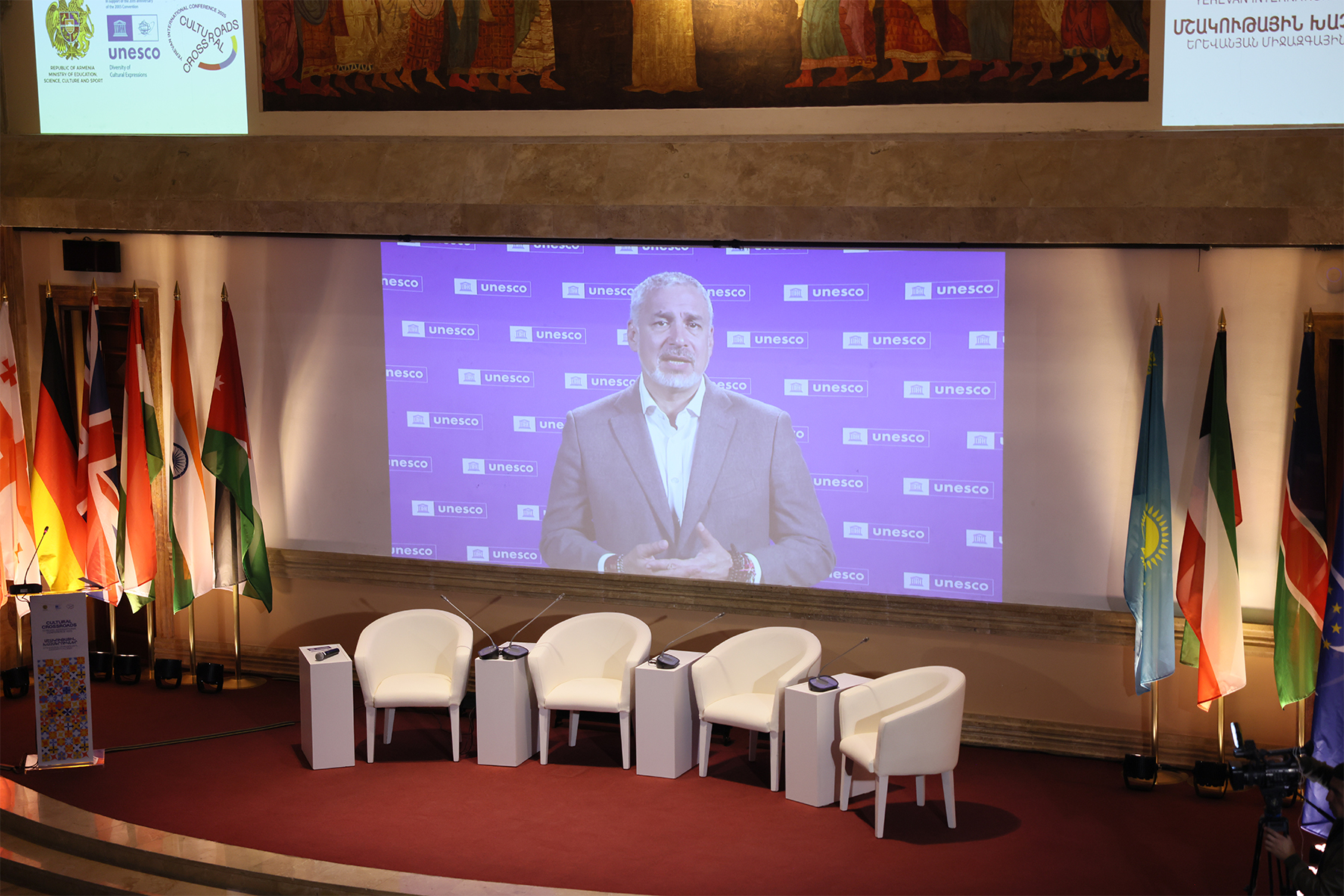 Տեսաուղերձով ներկաներին ողջունել է նաև Էռնեստո Օտտոնեն՝ ՅՈւՆԵՍԿՕ-ի գլխավոր տնօրենի տեղակալը: Նա բարձր է գնահատել Հայաստանի հանձնառությունը՝ որպես «Մշակութային ինքնարտահայտման ձևերի բազմազանության խրախուսման և պաշտպանության մասին» կոնվենցիայի կիրարկումն ապահովող բյուրոյի փոխնախագահ և կոնվենցիայի կոմիտեի 2025-2029 թթ անդամ: Նա հույս է հայտնել՝ համաժողովը կխթանի, որպեսզի մշակութային բազմազան արտահայտչաձևերը շարունակեն ոգեշնչել՝ կառուցելու կայուն, ստեղծարար ապագա: