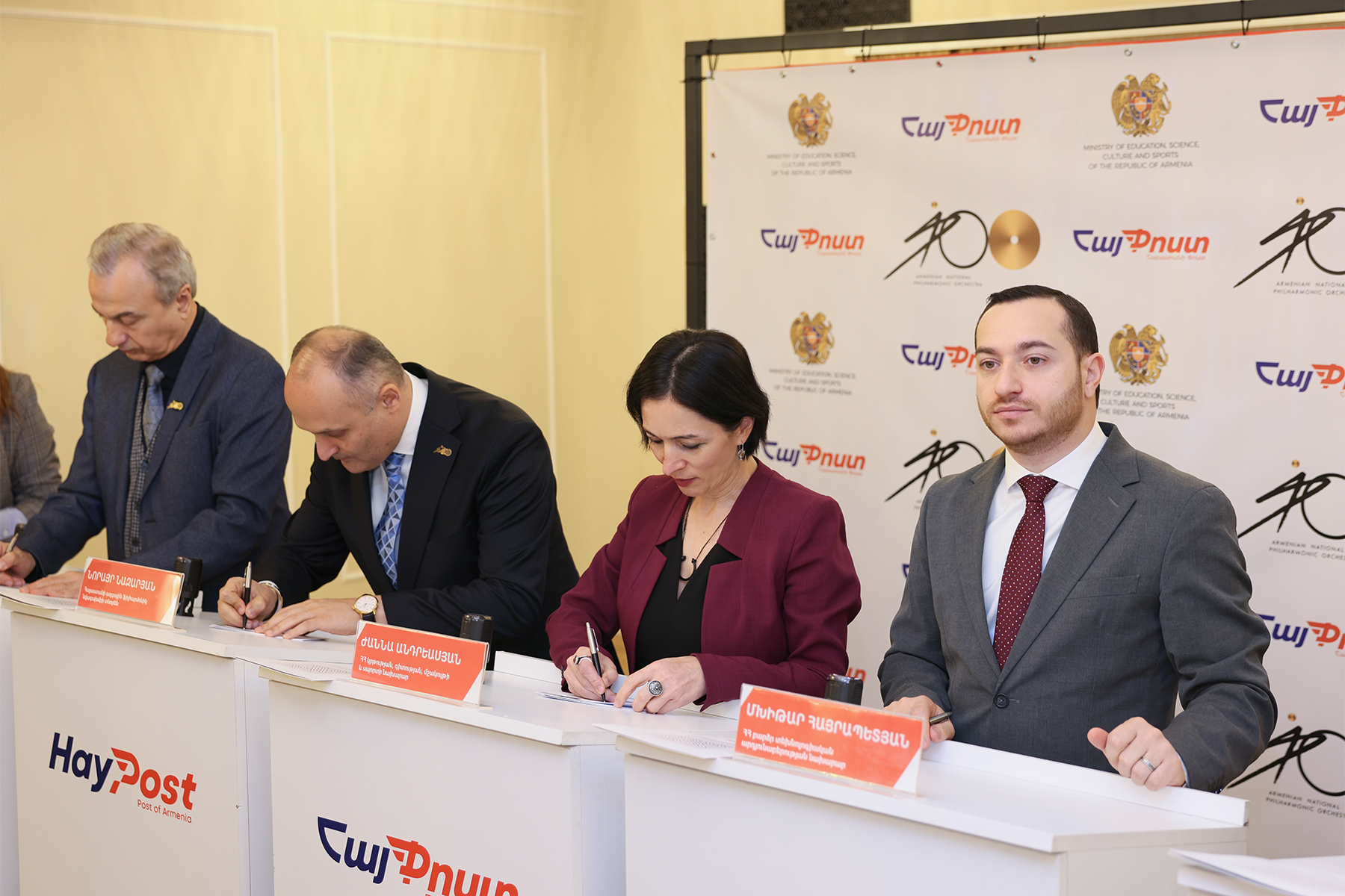 Շրջանառության մեջ է դրվել նամականիշ՝ նվիրված Հայաստանի ազգային ֆիլհարմոնիկ նվագախմբի հիմնադրման 100-ամյակին: Նամականիշի մարման արարողությանը մասնակցել են ԿԳՄՍ նախարար Ժաննա Անդրեասյանը, ԲՏԱ նախարար Մխիթար Հայրապետյանը, Հայաստանի ազգային ֆիլհարմոնիկ նվագախմբի գեղարվեստական ղեկավար և գլխավոր դիրիժոր Էդուարդ Թոփչյանը, Հայաստանի ազգային ֆիլհարմոնիկ նվագախմբի տնօրեն Նորայր Նազարյանը, «Հայփոստ» ՓԲԸ-ի գլխավոր գործադիր տնօրեն Շուշան Ալեքսանյանը և Ֆիլատելիստների հայկական ասոցիացիայի նախագահ Հովիկ Մուսայելյանը: