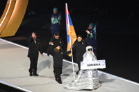 Մարզական շքերթի ընթացքում Հայաստանի դրոշակակիրը Կարինա Ակոպովա - Նիկիտա Ռախմանին գեղասահքի սպորտային զույգն էր։ Հայաստանն Օլիմպիական խաղերում ներկայացնում են նաև դահուկավազորդներ Միքայել Միքայելյանը, Կատյա Գալստյանը, լեռնադահուկորդ Հարություն Հարությունյանը: Վերջինս շքերթին մասնակցել է Բորմիոյից: