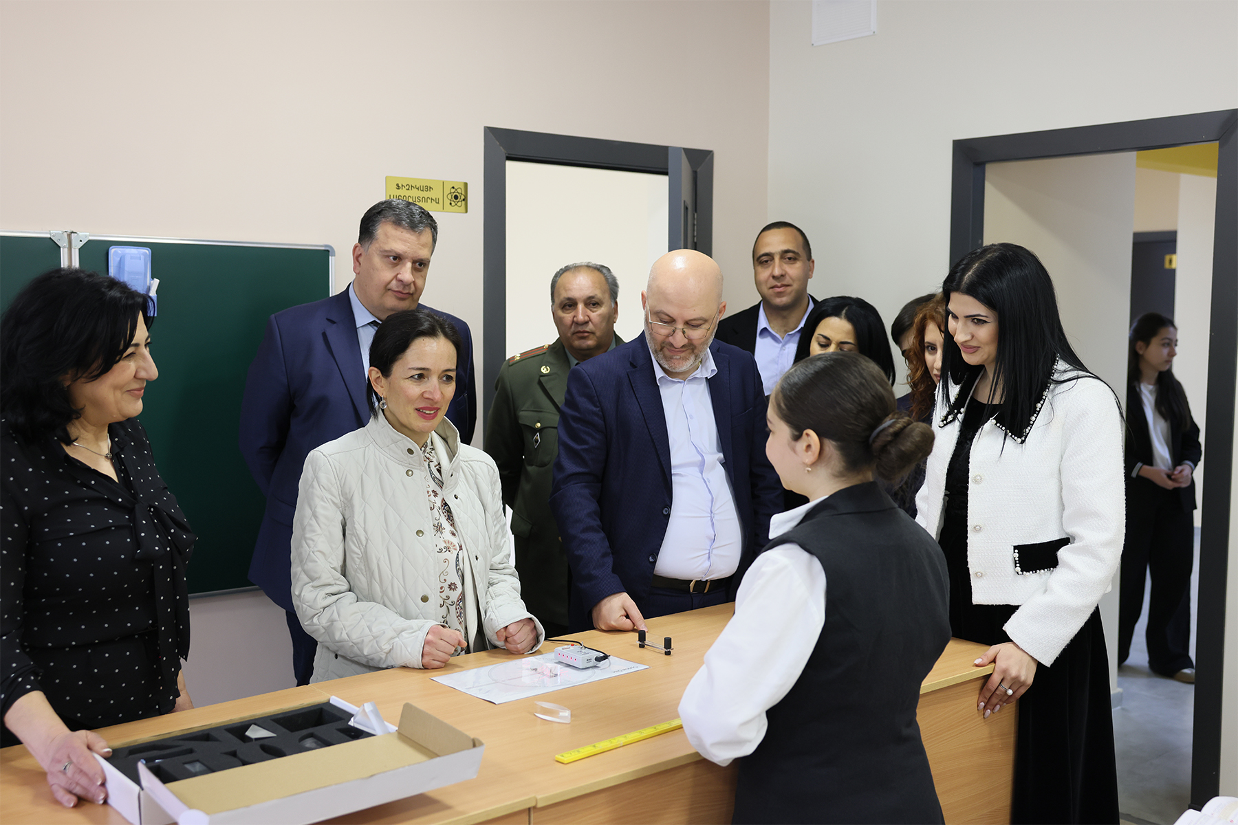 Ժաննա Անդրեասյանը նաև հետևել է ֆիզիկայի լաբորատորիայում իրականացվող ուսումնական գործընթացին և հետաքրքրվել աշակերտների տպավորություններով նոր պայմաններից՝ կարևորելով գործնական ուսումնառության դերը կրթության որակի բարձրացման գործում։