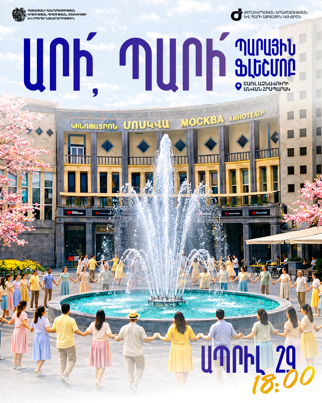 Ժամը 18:00` Հյուսիսային պողոտայում, Շառլ Ազնավուրի անվան հրապարակում, ԿԳՄՍ նախարարության բակում, Ալեքսանդր Սպենդիարյանի տուն-թանգարանի հարակից տարածքում միաժամանակ կմեկնարկեն պարային ֆլեշմոբեր։