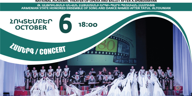 Հոկտեմբերի 6-ին, ժամը 18։00-ին, Ա. Սպենդիարյանի անվան օպերայի և բալետի ազգային ակադեմիական թատրոնում տեղի կունենա Թաթուլ Ալթունյանի անվան Հայաստանի երգի-պարի պետական համույթի մենահամերգը: